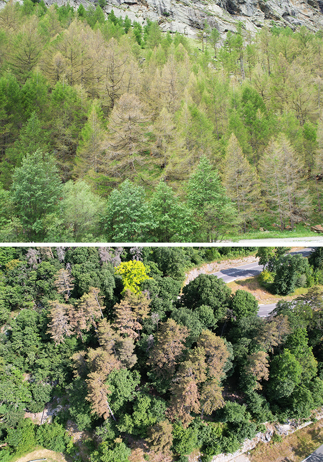 Oben: Lärchen im Saastal mit Frassschäden durch den Orangegelben Breitflügelspanner. Unten: Starke Saugschäden an Schwarzföhren im Waadtländer Jura, verursacht durch die Kiefernblutzikade.