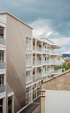 Blick auf das Haus D der Überbauung ‹Hobelwerk› in Oberwinterthur (Architektur: Pascal Flammer Architekten, Zürich; Ingenieure: Makiol Wiederkehr AG, Beinwil am See; B3 Kolb AG, Romanshorn; Aschwanden & Partner AG, Rüti). Der Bau war bereits 2024 Jurysieger beim Preis ‹Bester Neubau› des Verlags Archithema. Die Jury lobte ihn als gelungenes Experiment, das Schule machen sollte.