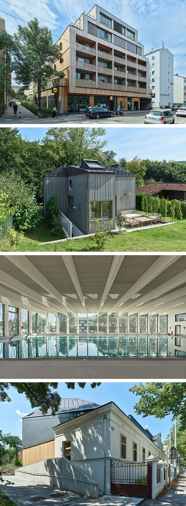 Von oben nach unten: ‹Woody – M› von Freimüller Söllinger Architektur, ‹Villa Minimale› von Clemens Kirsch Architektur, Trainingsschwimmhalle Großfeldsiedlung von ARGE illiz, Rudolf-Steiner-Schule Wien-Mauer von Dietrich Untertrifaller Architekten.