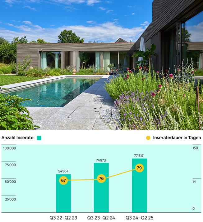 Inseratedauer und Angebotsmenge von Einfamilienhäusern in der ganzen Schweiz, Q3 2022 bis Q2 2025