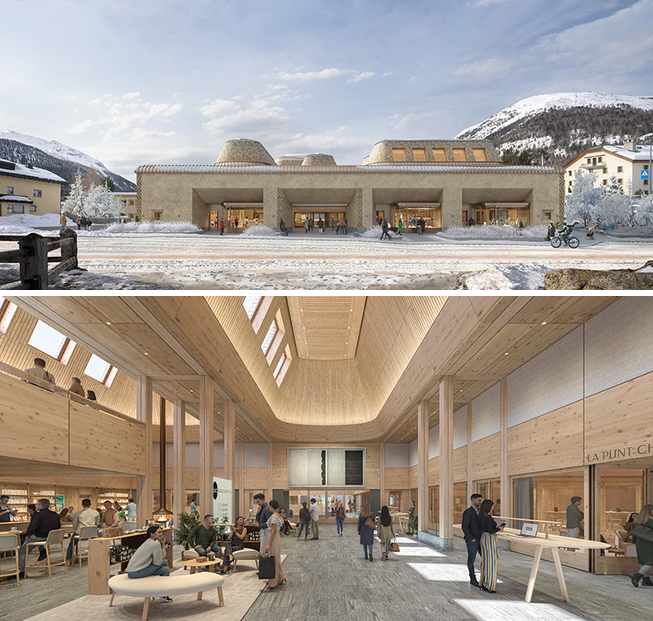 Die Aussenansicht des InnHub-Eingangs (oben) vereint modernes mit tradtionellem Engadiner Design. Eine einladende Lobby mit natürlichen Materialien, warmer Beleuchtung und offenen Bereichen für Zusammenarbeit soll die Besucherinnen und Besucher künftig willkommen heissen (unten). Seit dem Spatenstich im Juli dieses Jahres wurden bereits erste zentrale Arbeiten abgeschlossen. Bestehende Gebäude wurden zurückgebaut, rund 15000 m3 Erdmaterial ausgehoben, die Bodenplatte gegossen und die unterirdische Zufahrt erstellt. Bis Ende des Winters wird bereits ein Teil des Untergeschosses fertig sein, so dass im kommenden Sommerhalbjahr der Holzbau beginnen kann.