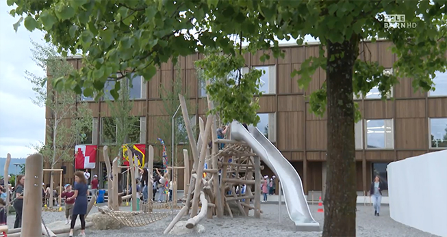 664 Bäume stecken im neuen Schulhaus Gyrisberg 1 in Jegenstorf, das am 7. Juni offiziell eingeweiht wurde. Die meisten von ihnen sind im hiesigen Wald gewachsen. Ins Bild klicken, um zum Beitrag von TeleBärn zu gelangen.