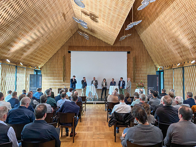 Podiumsdiskussion in Muri mit (v.l.n.r.) Holzindustrie-Präsident Jacques Rime, Ralf Bucher, Vizepräsident des Aargauer Grossrates, Lignum-Direktorin Sandra Burlet, Yvan Pahud, Nationalrat, Präsident der Lignum Waadt sowie Forstunternehmer-Präsident, WaldSchweiz-Direktor Christoph Niederberger und Paul Steffen, stellvertretender Direktor des Bundesamtes für Umwelt BAFU. Dritter von links: Moderator Michael Gautschi, Direktor von Holzindustrie Schweiz.