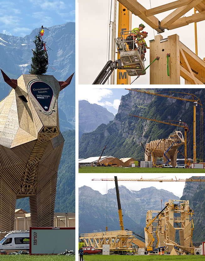 Als Holzbauingenieure waren die Experten der SJB Kempter Fitze AG aus Herisau mit im Boot. Gestaltung und Entwurf stammen von der Aroma Produktions AG, einer Eventagentur aus Zürich, die sich auf dreidimensionale Kommunikation spezialisiert hat. Arbeitsvorbereitung, Produktion und Montage lagen in den Händen der S. Müller Holzbau AG mit Sitz in Wil.