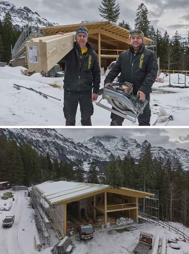 Fallbeispiel Müller Holzbau GmbH in Wengen: oben Vater und Sohn der Unternehmerfamilie Müller, unten der mit Unterstützung der Berghilfe realisierte Zimmereineubau.