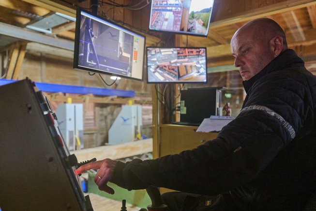 M- Yves Bernard dans la cabine de sciage de son entreprise à Sonvilier. Quelques clics suffisent et l'ordinateur commande le sciage de l'ensemble d'une grume.