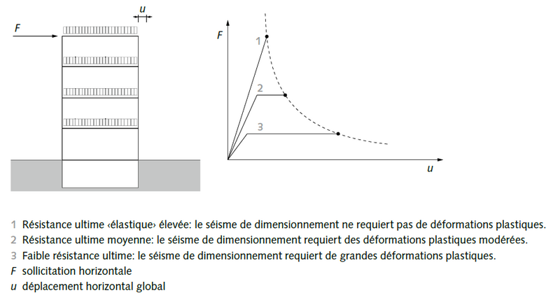 Une structure porteuse avec une capacité de déformation plastique élevée ne nécessitant qu’une faible résistance est recommandée en cas de sollicitations sismiques déterminantes par rapport à celle du vent. La ductilité globale se rapporte aux déformations de l’ensemble de la structure porteuse (à ne pas confondre avec la ductilité locale d’une liaison). Elle sert de base à la définition du coefficient de comportement q.
