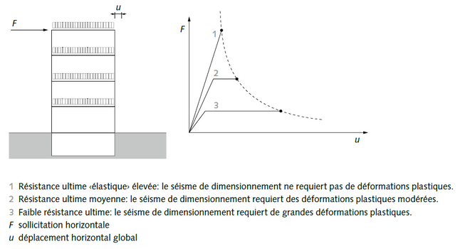 La ductilité sous sollicitation cyclique est, avec la résistance ultime, le paramètre le plus important du comportement sismique des structures. Par ductilité, on entend la capacité de déformation plastique caractérisée par des déformations irréversibles et une dissipation d’énergie. Pour obtenir un comportement sismique satisfaisant pour un séisme de référence donné, on peut choisir soit une résistance ultime élevée avec une faible ductilité, soit une résistance ultime faible avec une ductilité élevée, soit encore une résistance ultime moyenne avec une ductilité moyenne (figure 1). En cas de séisme s’écartant des conditions normatives, la configuration avec une ductilité élevée ne conduit pas à une augmentation des efforts au sein du système favorisant ainsi la robustesse de l’ouvrage.