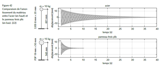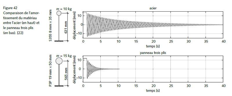 - Le bois et les matériaux à base de bois présentent un amortissement élevé comparé à d’autres matériaux. La figure 3 présente pour un panneau trois plis, un amortissement nettement plus élevé par rapport à l’acier, ce qui a également été observé pour l’OSB et pour le bois massif. Cet amortissement plus élevé entraine, dans les constructions bois, une réduction de l’amplitude lors d’une oscillation forcée et, par conséquent, une réduction des actions sismiques.