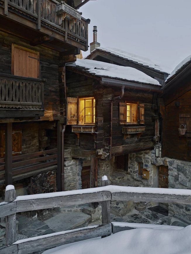 Dans un mode opératoire traditionnel ont été pratiqués après étude détaillée : une isolation naturelle de l’intérieur à la laine de mouton, une finition à la chaux et savon des menuiseries bois, une conservation des madriers anciens apparents dans le salon et la chambre à coucher en mémoire du lieu, la rénovation des fenêtres traitées dans le respect des contraintes patrimoniales, le remplacement des portes intérieures par des portes à pivot inspirées des raccards, la pose de pierre d’Evolène à différents endroits, la rénovation du poêle en pierre Ollaire ancien du chalet.