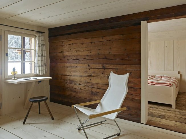 Le processus de rénovation intérieure consiste en la remise à niveau et la modernisation des espaces de vie : entrée, cuisine-salle à manger, salon, chambre à coucher et salle de bain. Il s’opère par la mise à nu intégrale de l’enveloppe intérieure afin de révéler les madriers en mélèze qui porteront une nouvelle enveloppe réalisée en épicéa et inspirée des formats de l’époque en lames larges de 300 à 550 mm selon une technique de menuiserie traditionnel.